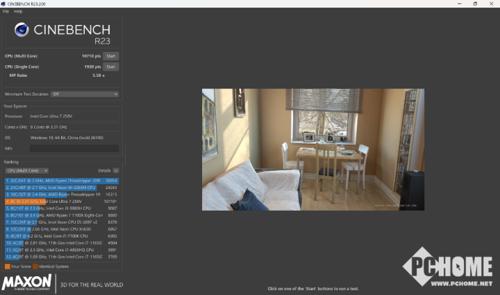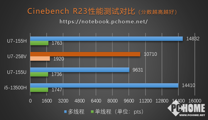 在CINEBENCH R23的测试中,Ultra 7 258V取得了单核1920 pts,多核10710 pts的成绩,单核成绩相比酷睿Ultra 7 155U,高出约10%左右,多核成绩即使由于取消了超线程,总共8核心8线程的情况下,相比2颗性能核心8颗能效核心共12核14线程的Ultra 7 155U性能也高出约11%,无论是单核性能还是多核性能都更为强悍,Ultra 7 258V在更低的功耗范围(17~37W)内,相比Ultra 7 155U(15~57W)的能效大幅提升,这是先进的制程与架构两方面带来的巨大利好。