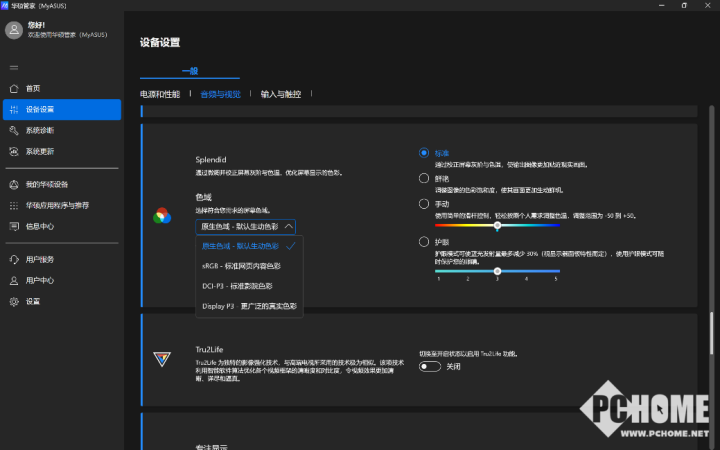 在预装的MyASUS软件中,还可以在原生、Display P3、DCI-P3、sRGB四种专业色域之间自由切换,获得最适合、最精准的色彩显示效果。