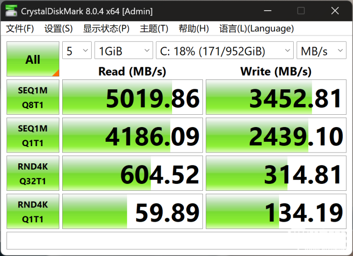 硬盘方面,华硕灵耀14 Air搭载了来自西数的NVMe PCIe 4.0固态硬盘,容量1TB,在CrystalDiskMark的测试中,连续读写速度分别为5019.86 MB/s、3452.81 MB/s,4K随机读写速度分别为59.89 MB/s、134.19 MB/s,整体表现可圈可点,处于目前主流轻薄本的第一梯队,无论是拷贝大容量文件,还是加载大型程序,都更快。