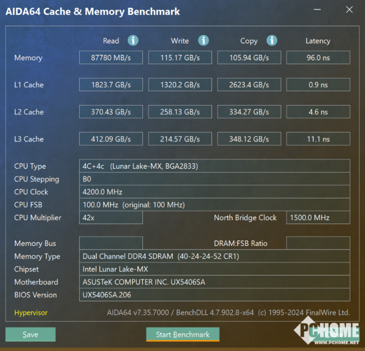 内存方面,由于这次酷睿Ultra 200V首次集成了MoP封装式内存,最高32GB LPDDR5X规格,频率达到8533MHz。在AIDA64 Cache&Memory Benchmark的测试中,内存读取、写入、复制速度分别为87780 MB/s、115.17 GB/s、105.94 GB/s,延迟96.0 ns,由于新版AIDA64还未对MoP内存进行全完优化,因此测试结果还未完全发挥出内存实力。总之,与CPU集成在一起的内存频率更高、性能更快,为我们的日常使用带来不少性能加成,从此告别卡顿。