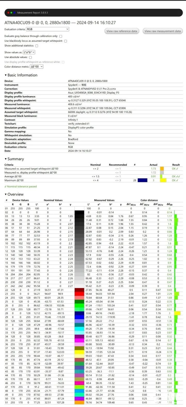 在我们的实测中,华硕灵耀14 Air的这块显示屏色域实现了100%的sRGB和99.7%的DCI-P3色域覆盖,色彩准确性方面表现更是专业级,在Display P3色域下,平均偏差ΔE仅为0.91,无疑是专业级显示器才有的素质,即使你是专业设计师、摄影师这类用户,对这台笔记本的色彩表现也会满意。