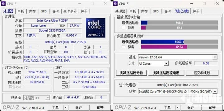 首先在CPU-Z的测试中,Ultra 7 258V多线程得分与第九代桌面酷睿i9不相上下,要知道后者可是默认95瓦的功耗,灵耀14 Air的能效比可见一斑。