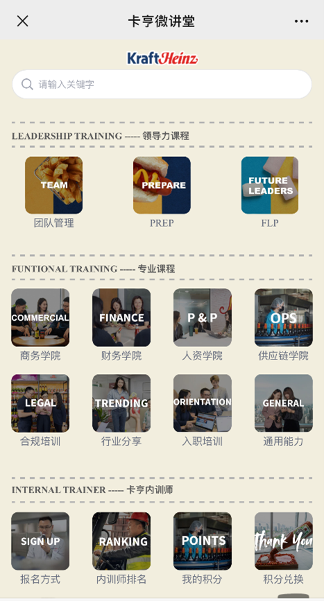 其中,“培训学院”为员工定制学习方案、提供学习资源,包含领导力与文化、金融、营销、采购、IT、运营、研发、法律、人力资源、销售等十个板块,下设不同课程。如,运营板块包含精益六西格玛、食品安全与质量、库存与预测、供应链等课程,营销板块包含营销工具和模板、数据分析与可视化、公共关系等课程。“培训学院”还提供双语课程资源,满足员工多元发展需求。而“卡亨微讲堂”更适合手机端碎片化学习,课程资源多由员工内训师提供。通过这些多元化的内部培训平台,员工可以更加便捷地获取所需知识和技能,更好地面对和处理工作中遇到的挑战,实现个人与企业的共同成长。