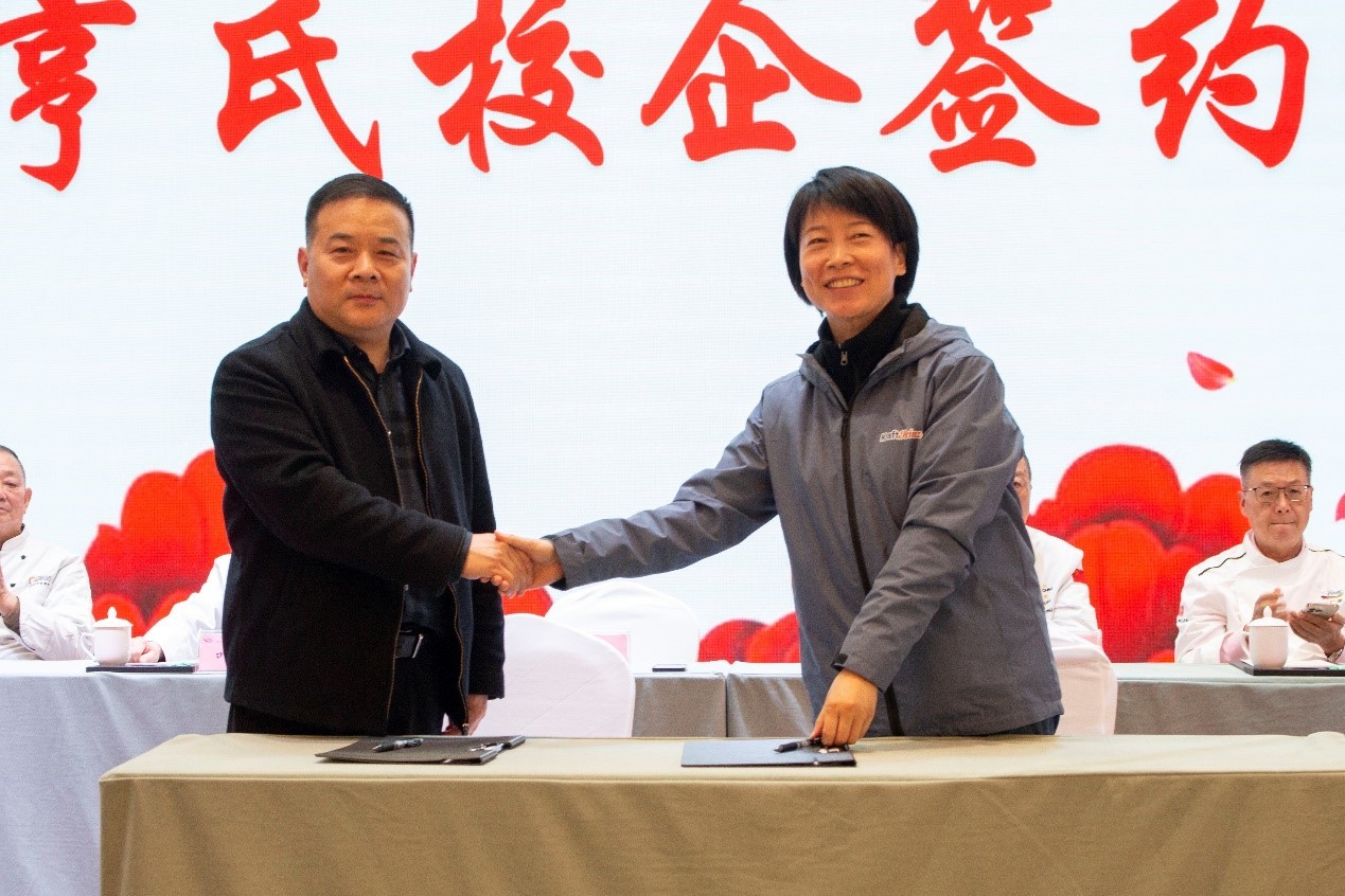 杭州市西湖职业高级中学校长张德成与卡夫亨氏东区销售总经理王丽芳代表签约