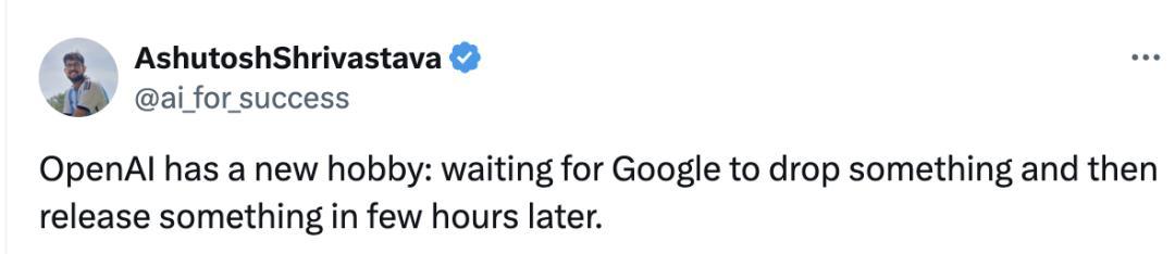 X 上有用户不禁感叹,OpenAI 已经养成了一个新爱好。等着 Google 发布一个更新,几个小时后马上发布一个更新。