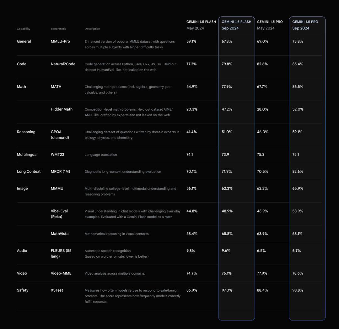 模型升级的重点主要为 1.5 Pro 价格降低 >50%、1.5 Flash 的速率限制提高了 2 倍,1.5 Pro 的速率限制提高了约 3 倍、输出速度提高 2 倍,延迟降低 3 倍;过滤器切换为选择加入。