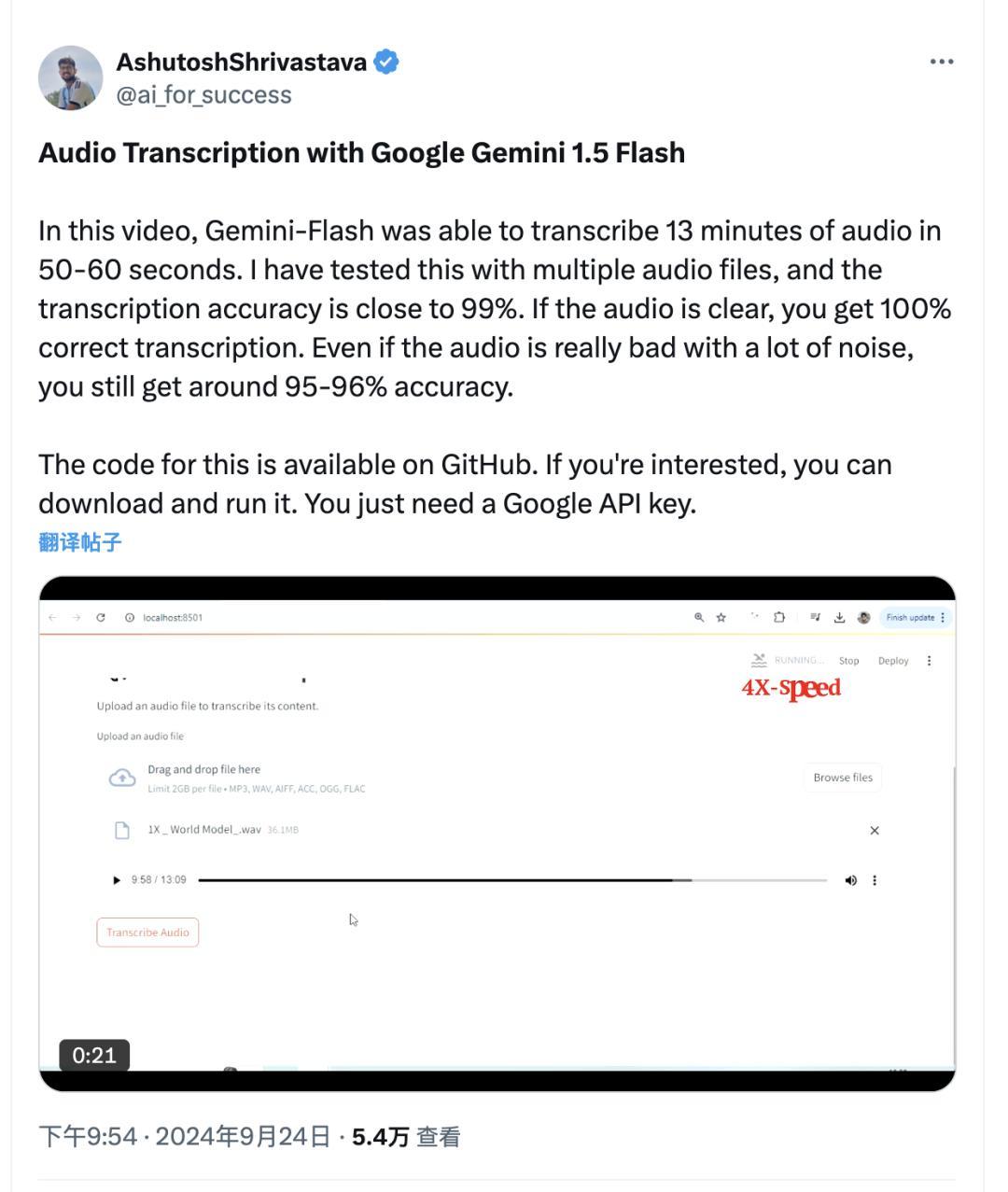 X 上的 AshutoshSrivastava 就表示,他使用 Google Flash 构建了一个应用,能够在 1 分钟内转写 13 分钟的长音频,且准确度很高(且免费)。在另一个应用中,他表示目标探测功能的表现也很不错。
