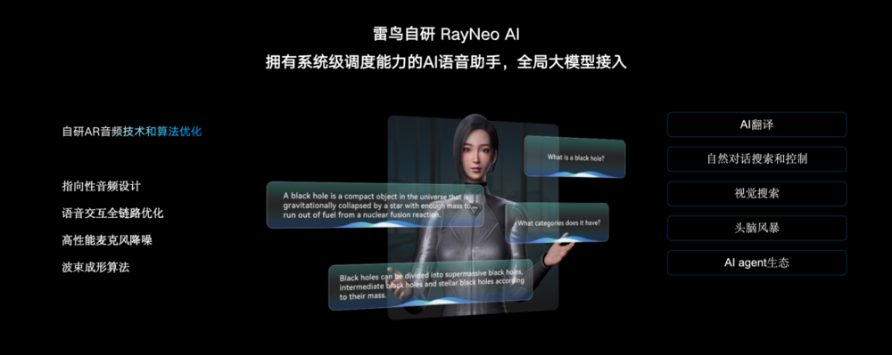 AI大模型应用落地是雷鸟创新今年在产品技术布局上的重要成果之一。凭借着完整的AI+AR生态体系,雷鸟创新发布了首个AI+AR眼镜操作系统RayNeo AI OS,为AR眼镜提供高效、便捷、多模态的交互体验,并支持如智能助理、AI翻译、识图等多种AI应用与场景。
