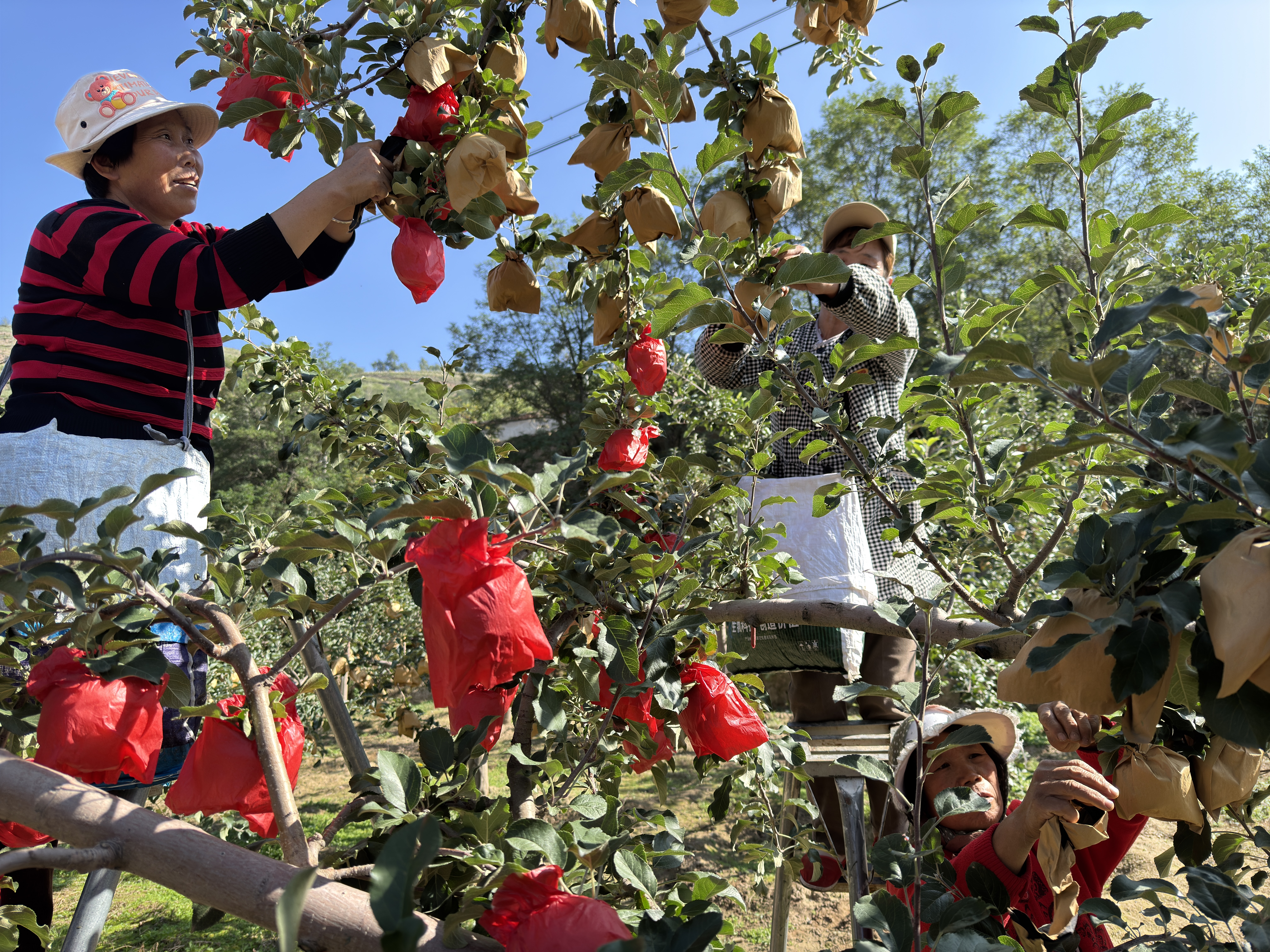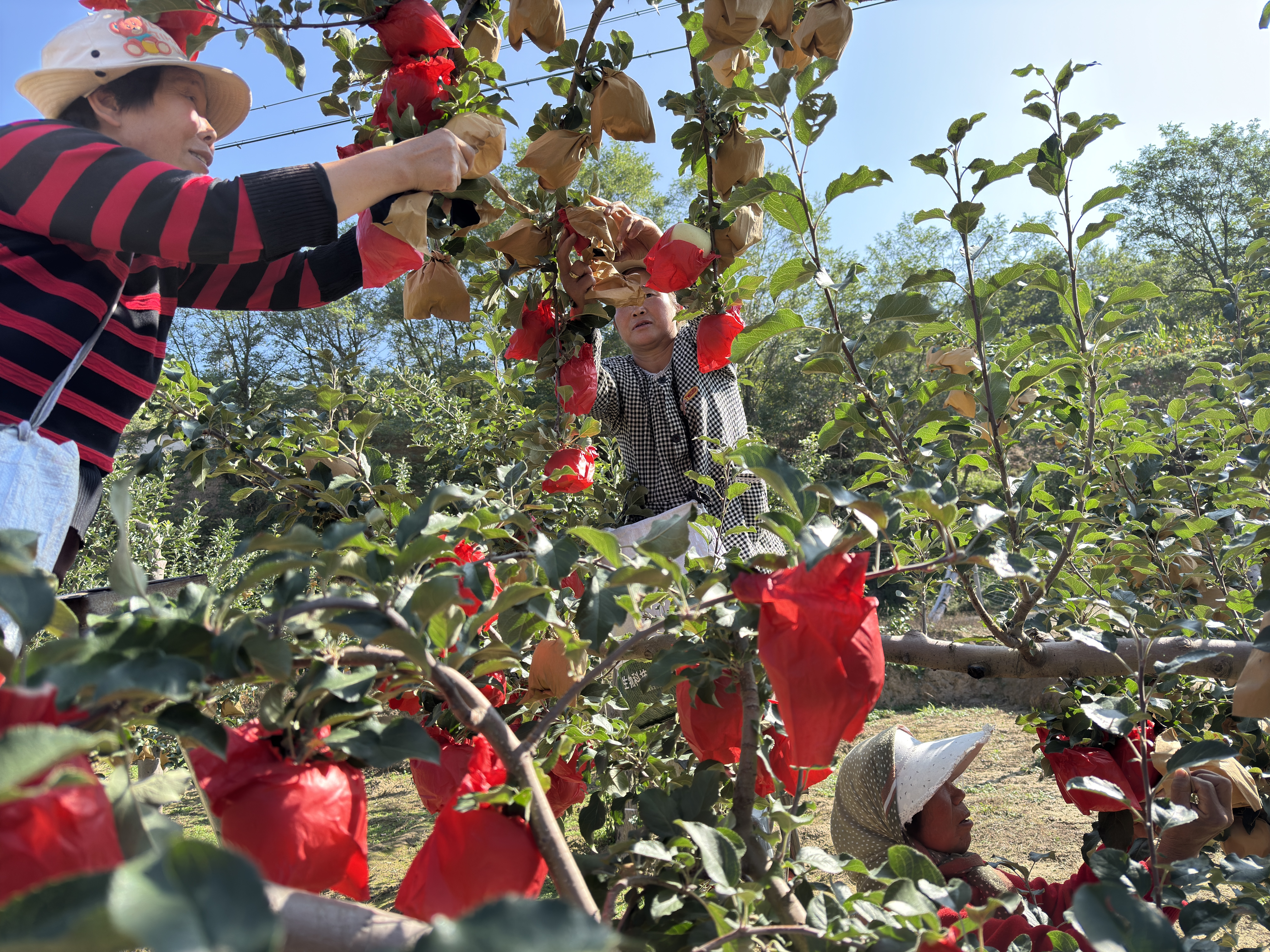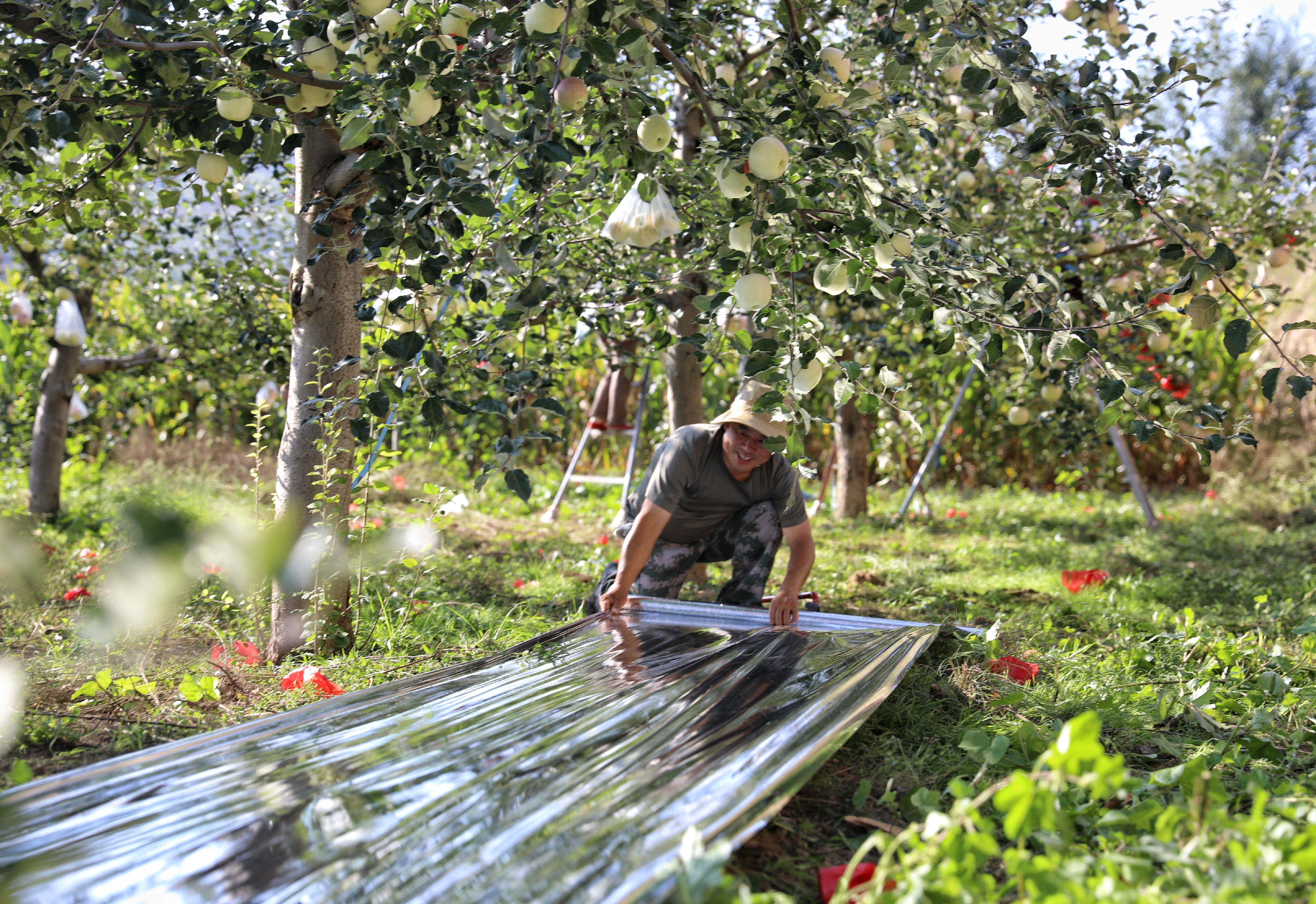 9月24日,静宁县古城镇西湾村果农在果园里给苹果摘袋,喜迎丰收。连日来,静宁县百万亩果园75亿只果袋到了摘袋期,果农们抢抓晴好天气,深入果园取袋摘袋,喜迎累累硕果,期待卖上好价钱有个好收入。(李芳艳 靳万强 程兵虎 摄)