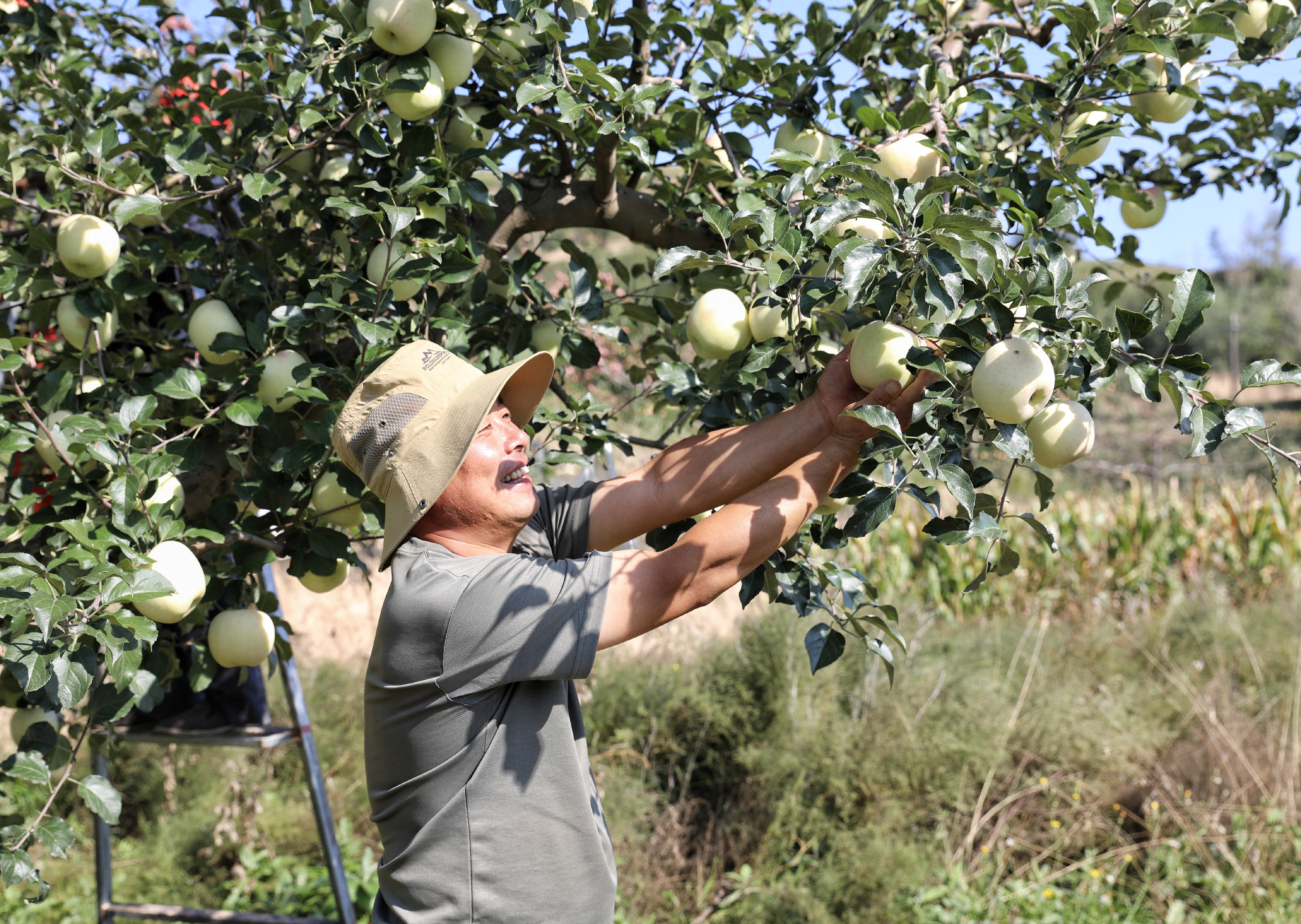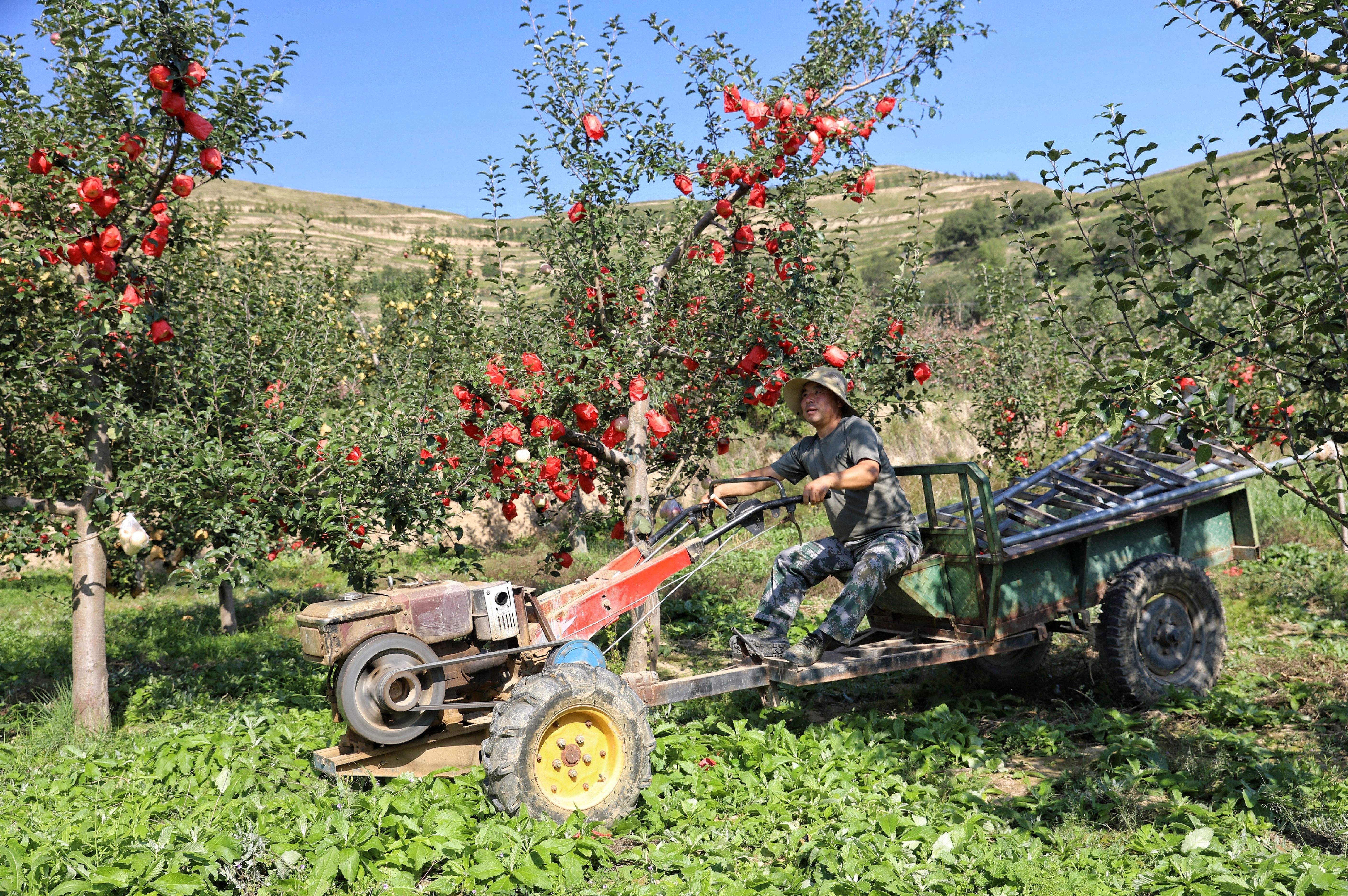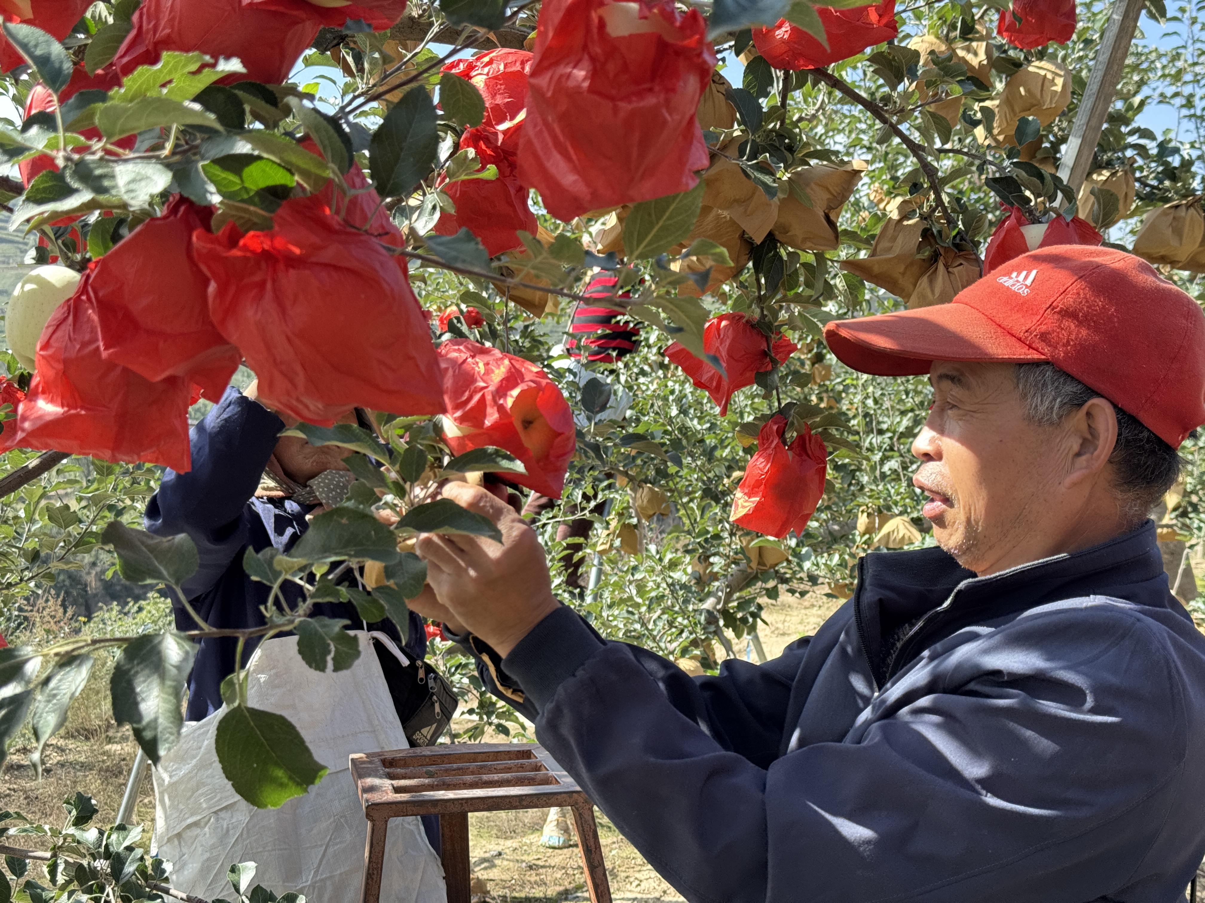 9月24日,静宁县古城镇西湾村果农在果园里给苹果摘袋,喜迎丰收。连日来,静宁县百万亩果园75亿只果袋到了摘袋期,果农们抢抓晴好天气,深入果园取袋摘袋,喜迎累累硕果,期待卖上好价钱有个好收入。(李芳艳 靳万强 程兵虎 摄)