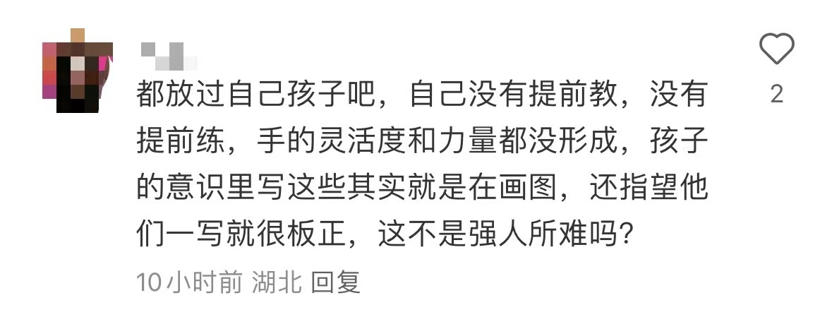 在家长吐槽孩子写字丑的帖子下方,记者发现,不乏家长分享自己提前送孩子去练字班,因此在写字上写得更为整洁规范。但是也有网友称,一年级阶段孩子写字就像画画一样,多鼓励孩子才能激发孩子写字的信心,字肯定是写多了就写好了。