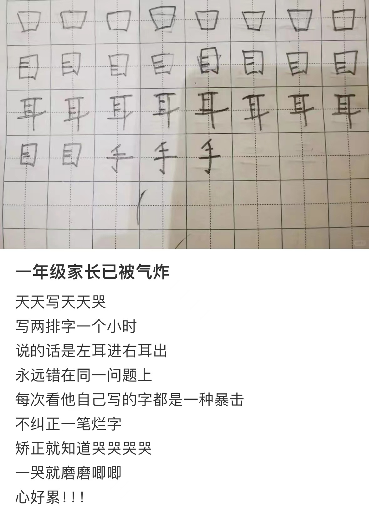一网友吐槽自己陪孩子写作业。图/某社交平台