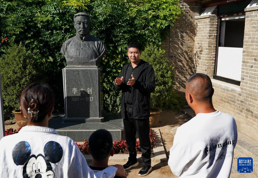 9月22日,赵书明在河北省乐亭县大黑坨村李大钊故居给游客讲述李大钊的事迹。