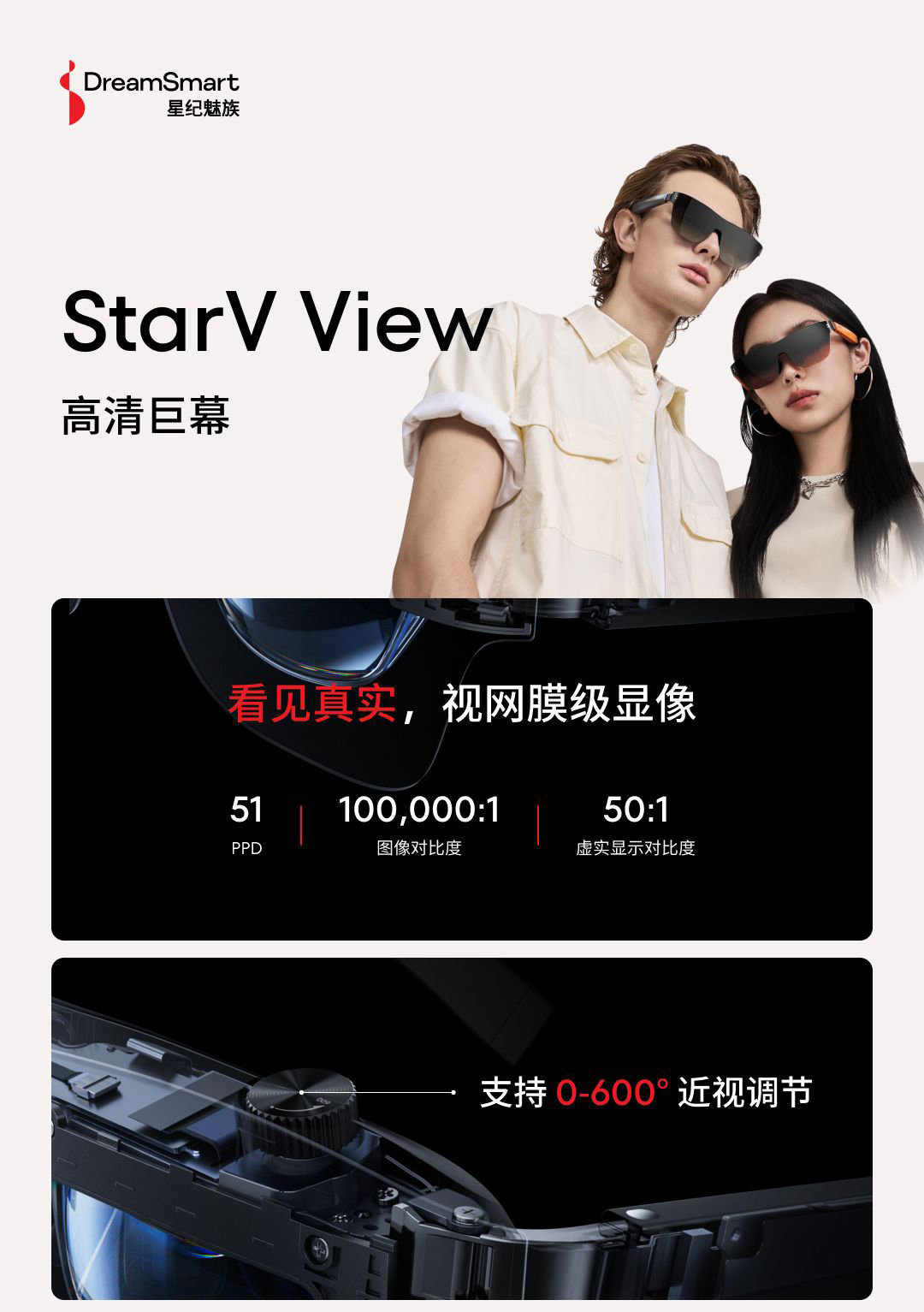 StarV View 则采用了 BirdBath 技术方案,整机重量约 74 克。该款眼镜支持 0-600 度的近视调节,无需安装近视镜片,并且通过了 SGS 低蓝光认证和 SGS无频闪认证。