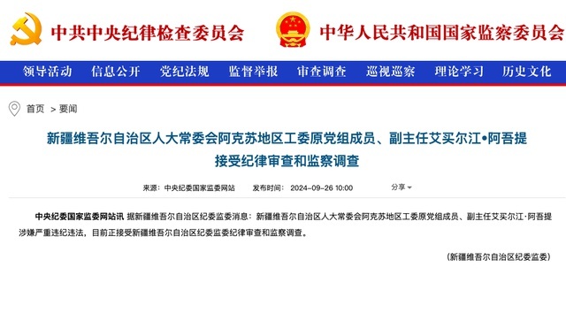 9月26日,据中央纪委国家监委网站消息:新疆维吾尔自治区人大常委会阿克苏地区工委原党组成员、副主任艾买尔江·阿吾提涉嫌严重违纪违法,目前正接受新疆维吾尔自治区纪委监委纪律审查和监察调查。