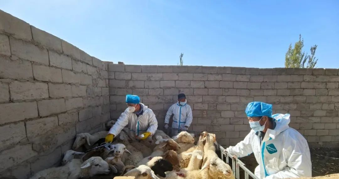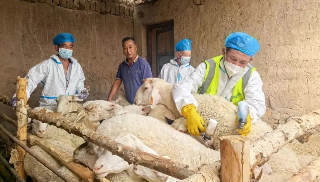 在瓜州县西湖镇向阳村缐文奎家的圈舍里,防疫员身着防护服、身背喷雾器、携带疫苗和注射器具,严格按照操作规范对养殖区域进行消毒灭源,并为牲畜注射疫苗。