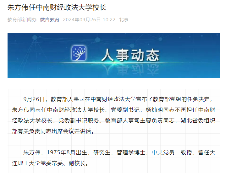 9月26日,教育部人事司在中南财经政法大学宣布了教育部党组的任免决定,朱方伟同志任中南财经政法大学校长、党委副书记,杨灿明同志不再担任中南财经政法大学校长、党委副书记职务。教育部人事司主要负责同志、湖北省委组织部有关负责同志出席会议并讲话。
