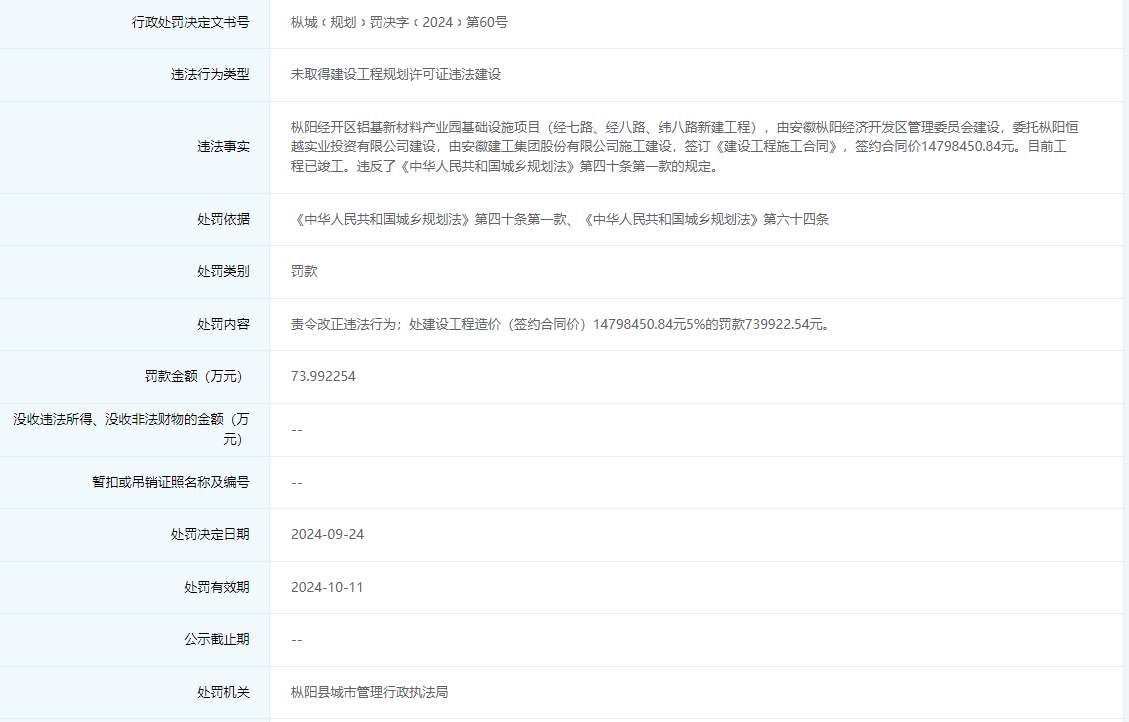 枞城﹝规划﹞罚决字﹝2024﹞第60号信息显示,枞阳经开区管委会违法建设枞阳经开区铝基新材料产业园基础设施项目(经七路、经八路、纬八路新建工程),被处罚款73.992254万元。