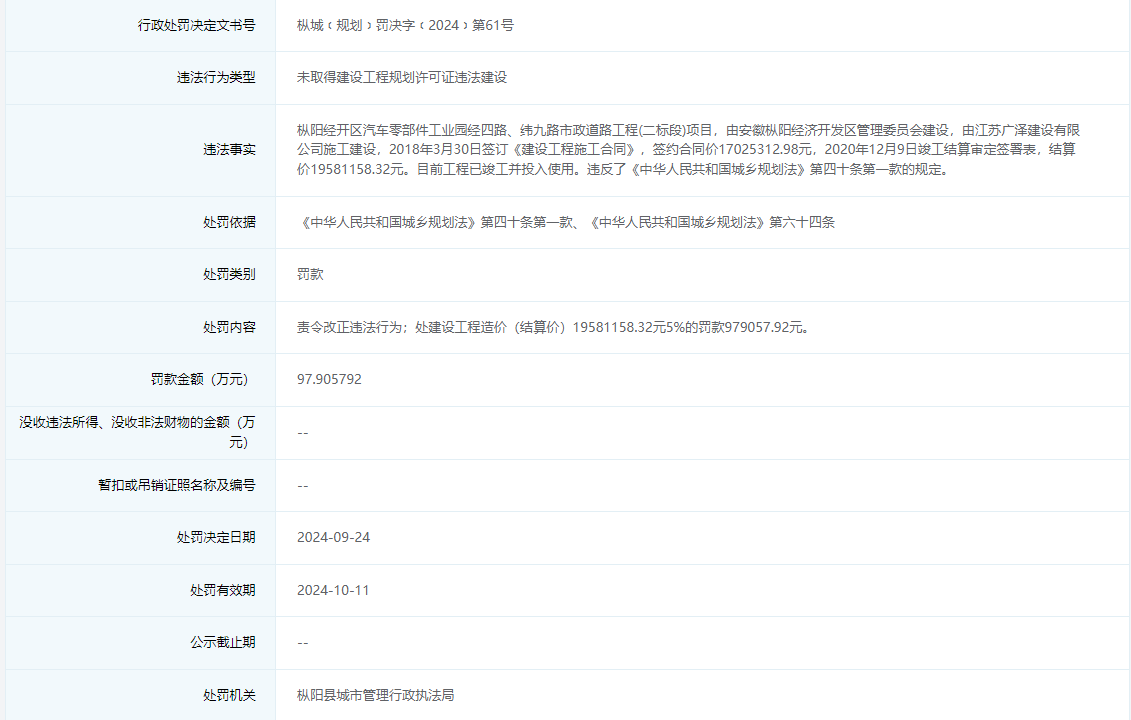 枞城﹝规划﹞罚决字﹝2024﹞第61号信息显示,枞阳经开区管委会违法建设枞阳经开区汽车零部件工业园经四路、纬九路市政道路工程(二标段)项目,被处罚款97.905792万元。