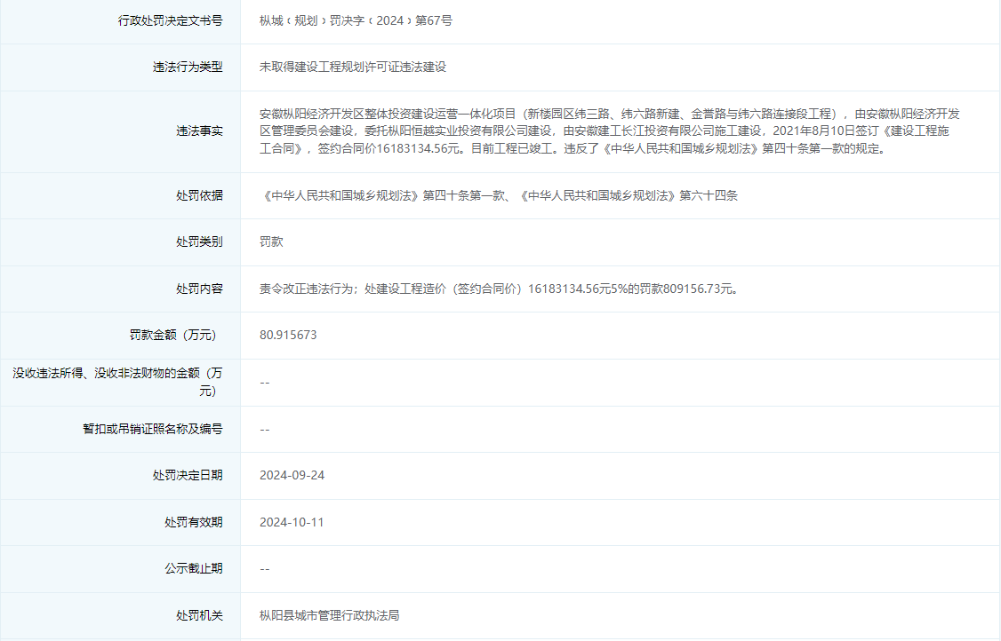 枞城﹝规划﹞罚决字﹝2024﹞第67号信息显示,枞阳经开区管委会违法建设安徽枞阳经济开发区整体投资建设运营一体化项目(新楼园区纬三路、纬六路新建、金誉路与纬六路连接段工程),被罚款80.915673万元。