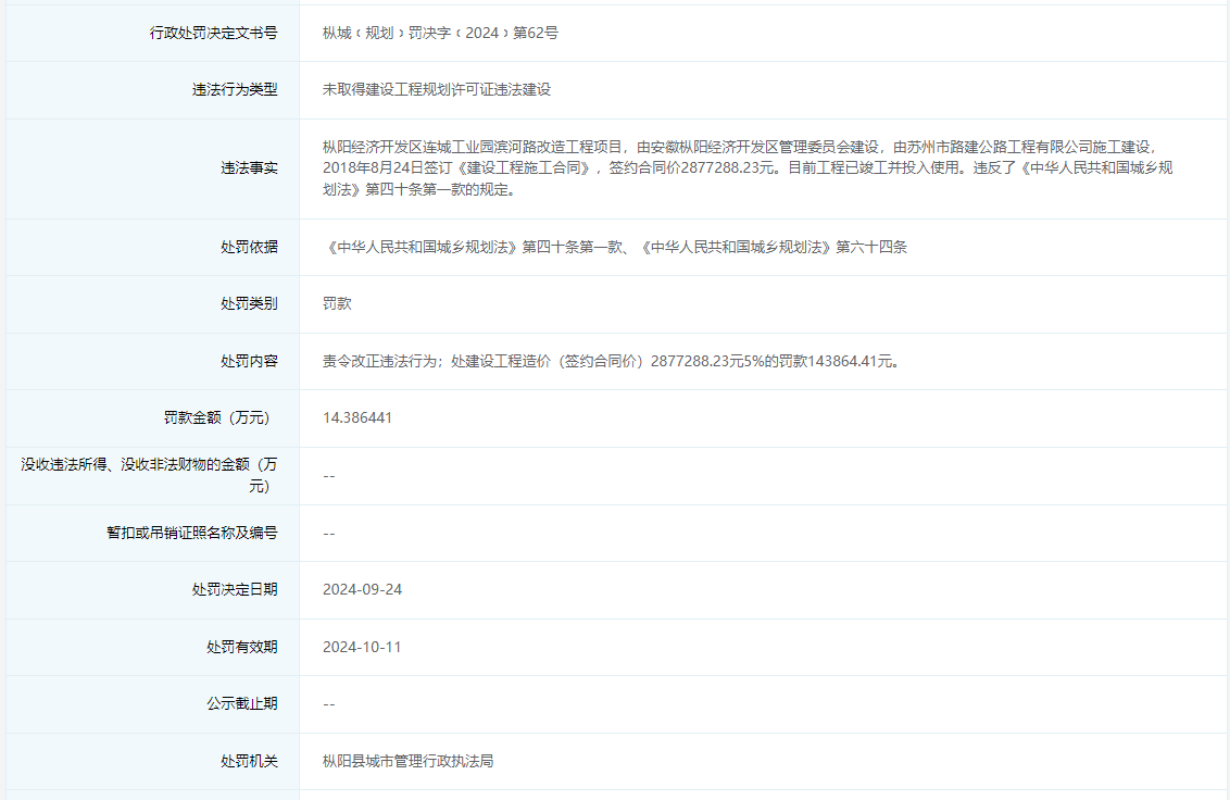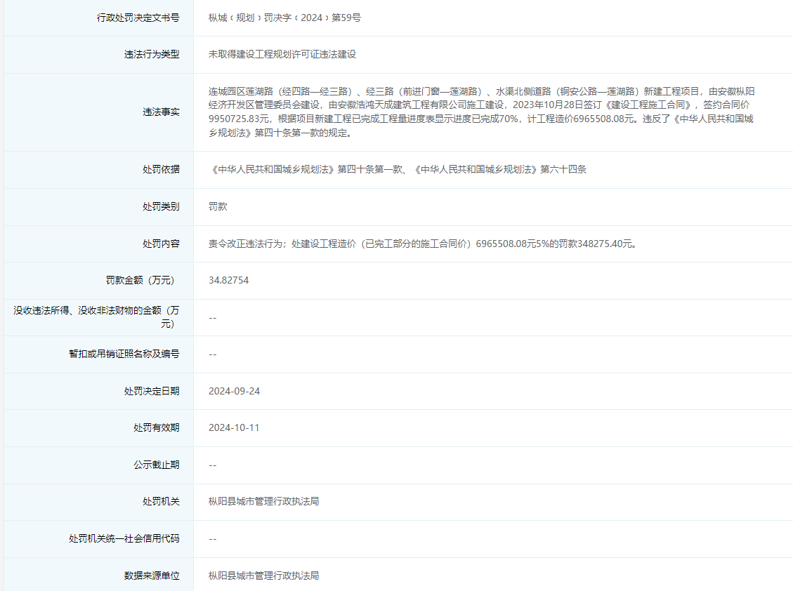 枞城﹝规划﹞罚决字﹝2024﹞第59号信息显示,枞阳经开区管委会违法建设枞阳县连城园区莲湖路(经四路—经三路)、经三路(前进门窗—莲湖路)、水渠北侧道路(铜安公路—莲湖路)新建工程项目,被处罚款34.82754万元。