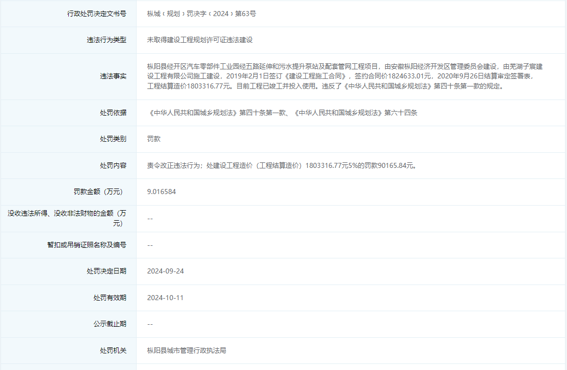 枞城﹝规划﹞罚决字﹝2024﹞第63号信息显示,枞阳经开区管委会违法建设枞阳县经开区汽车零部件工业园经五路延伸和污水提升泵站及配套管网工程项目,被处罚款9.016584万元。