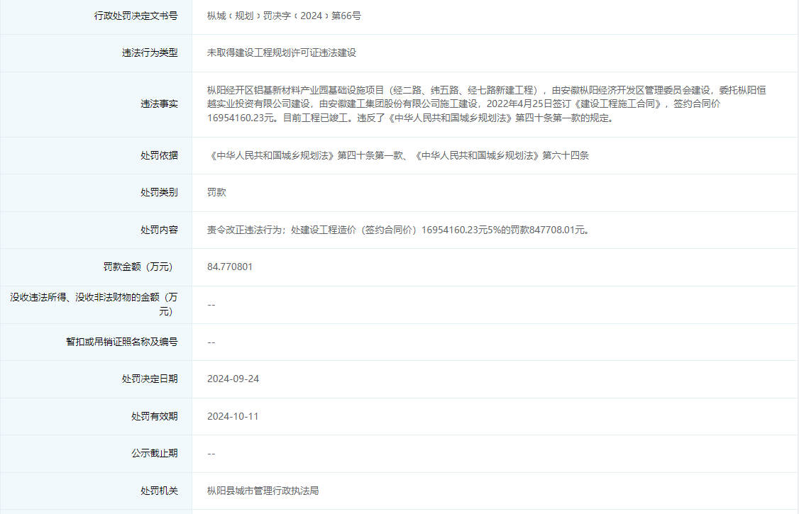 枞城﹝规划﹞罚决字﹝2024﹞第66号信息显示,枞阳经开区管委会违法建设枞阳经开区铝基新材料产业园基础设施项目(经二路、纬五路、经七路新建工程),被罚款84.770801万元。