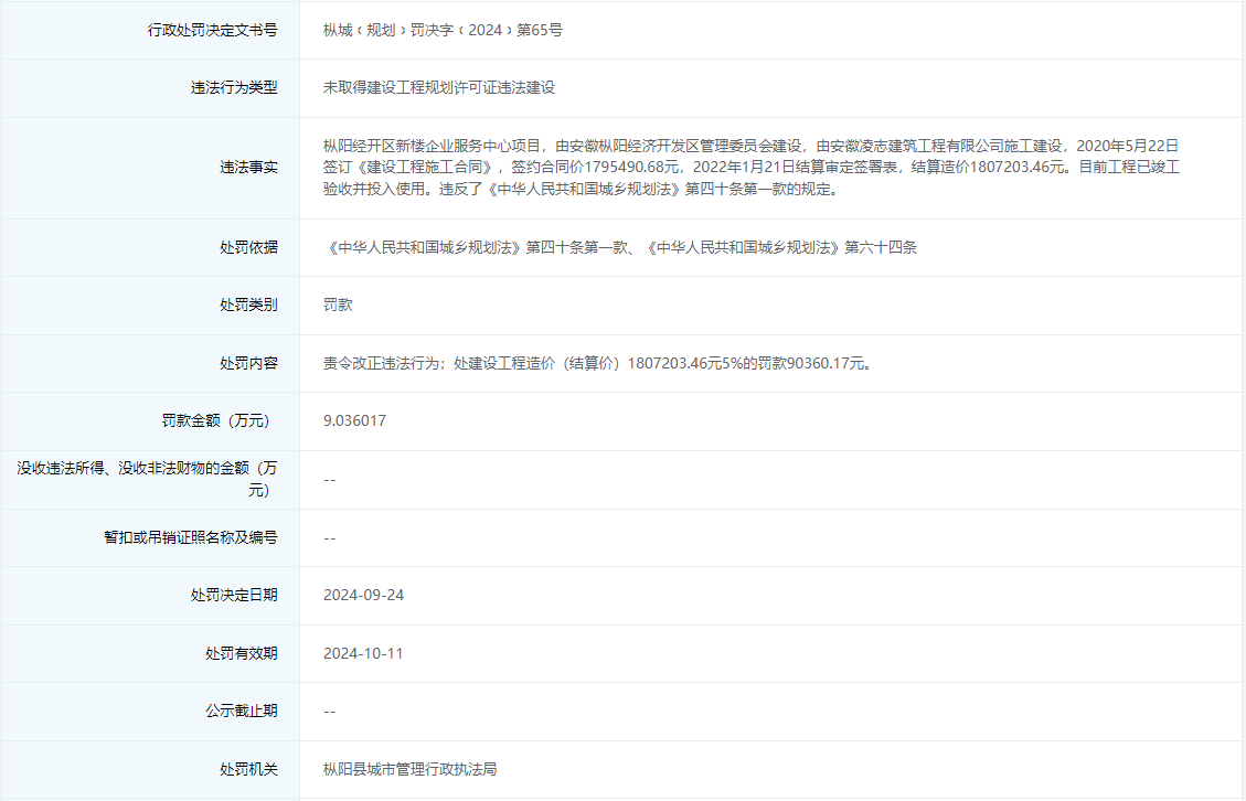 枞城﹝规划﹞罚决字﹝2024﹞第65号信息显示,枞阳经开区管委会违法建设枞阳经开区新楼企业服务中心项目,被处罚款9.036017万元。