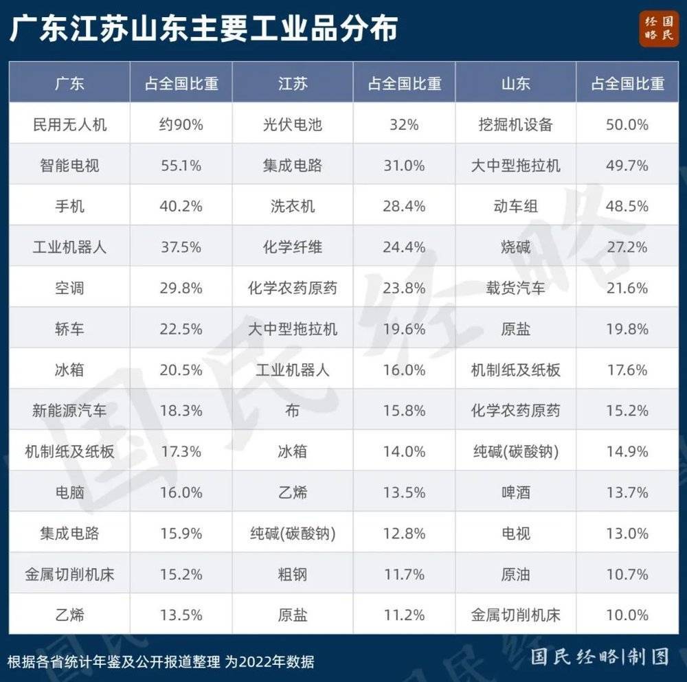 山东拥有冶金、化工、建材等6个万亿级产业,广东的8大万亿级产业覆盖新一代信息技术、汽车、智能家电、软件和信息服务、智能家电等方方面面。