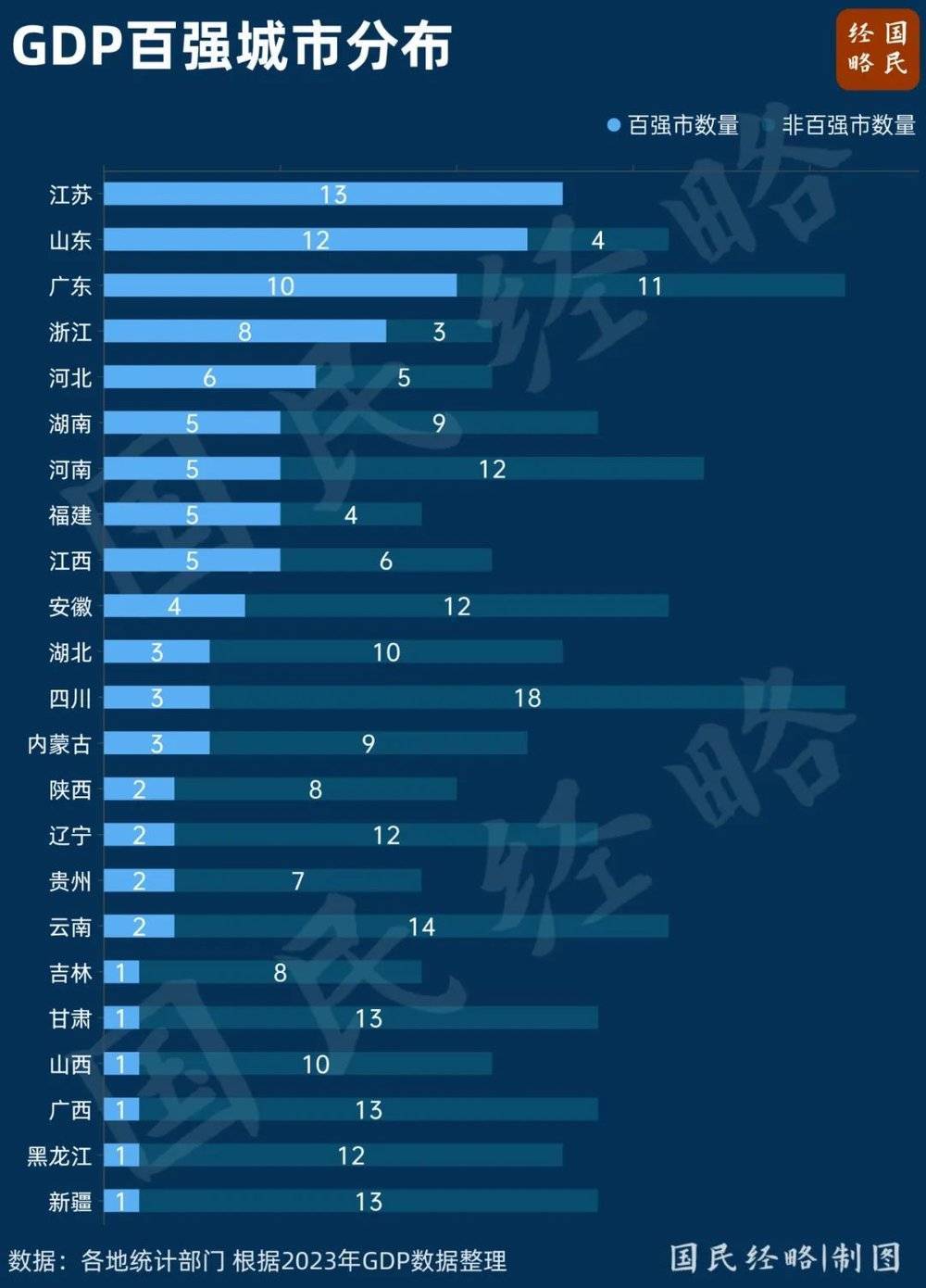 虽然没有TOP10城市,但无论是百强市还是百强县,山东都名列前茅,与其经济第三大省的地位相匹配。