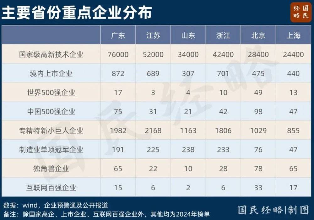 不只是500强企业,无论是国家级高新技术企业、上市企业还是独角兽企业,山东与广东、江苏甚至浙江,都存在一定差距。