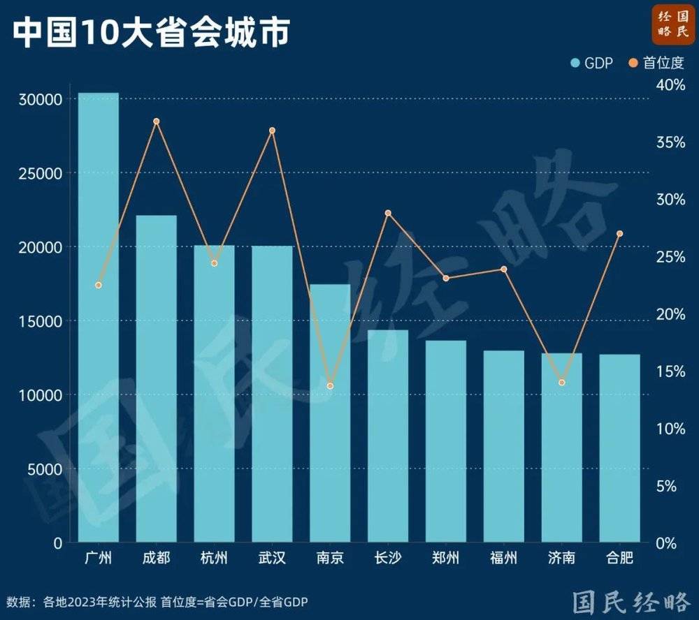 这里的“弱”,不是经济总量不行,而是首位度太低,南京济南只有14%左右,双双垫底。