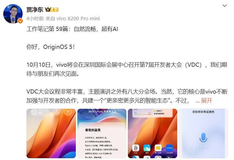 9 月 26 日,vivo 品牌副总裁兼品牌与产品战略总经理贾净东在微博上透露了全新的 OriginOS 5.0 的部分截图,并再一次宣布了 10 月 10 日 vivo 开发者大会将在深圳举办的消息。
