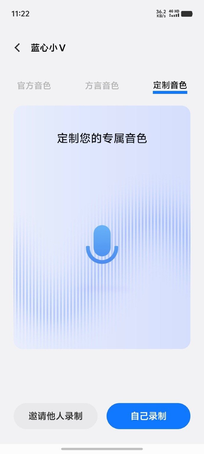 最后一张截图则是介绍了蓝心小 V 在语音方面的改进,表示全新版本将会增加专属音色,包含自行录制和邀请别人录制等,也算是一个比较有趣味的设计了。