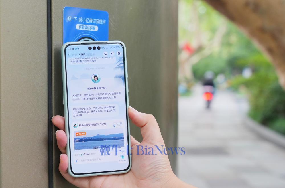 (在西湖边的文旅咨询亭,用手机碰一下“杭小忆智能贴”唤起智能体)