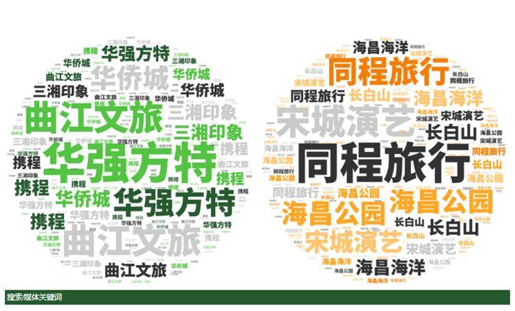 媒体指数|媒体指数整体表现呈小幅下降态势,主要得分集中在垂直网站宣传和头部财经纸媒的宣传,得分TOP5的品牌分别为是同程旅行、宋城演艺、海昌公园、长白山、海昌海洋。本月的媒体稿件中,热度较高的关键词为、人事任命、战略合作、地方文旅动态等,如同程旅行终止收购广州旅金科技55.14%股权;上海迪士尼乐园将建首个大型漫威主题景点;苏州太湖海昌海洋乐园项目签约等媒体稿件热度较高。