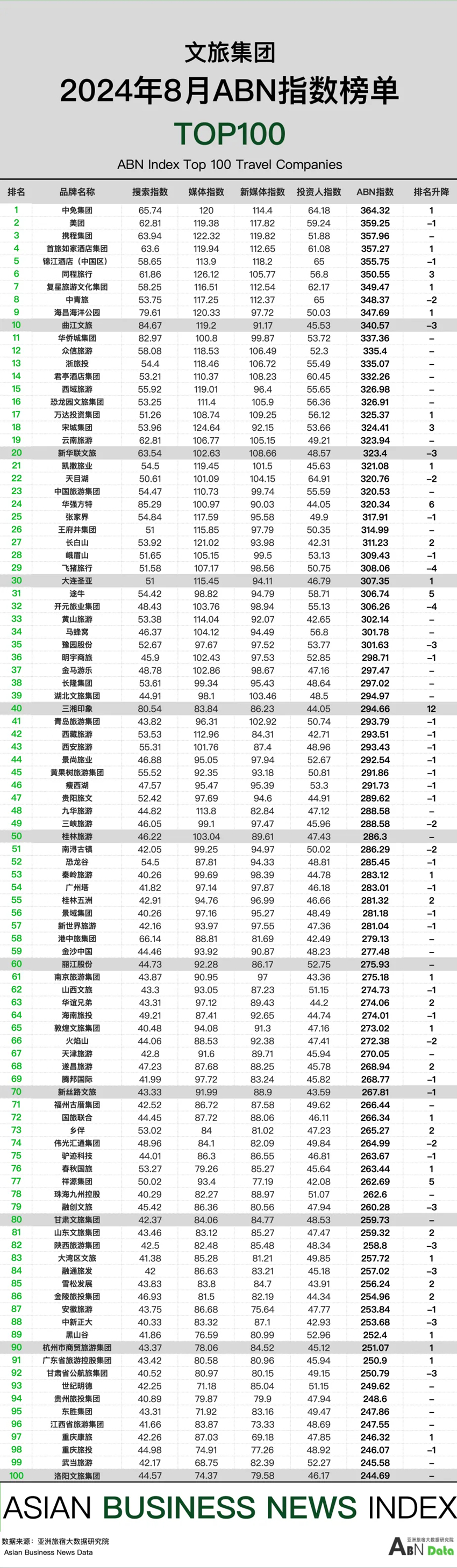 综述|2024年8月,文旅企业的媒体指数和新媒体指数稳中略降,监测均分达到111.27,116.69,投资人指数保持平稳。