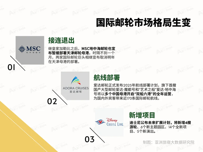 爱达邮轮发布2025航线部署计划。8月,值上海国际邮轮节期间,爱达邮轮(Adora Cruises)正式发布2025年航线部署计划,旗下首艘国产大型邮轮爱达·魔都号和“艺术之船”爱达·地中海号将以多个母港开启“双船六港”的全年运营,为国内外宾客带来近170条国际邮轮航线,满足消费者多元化的出行需求。
