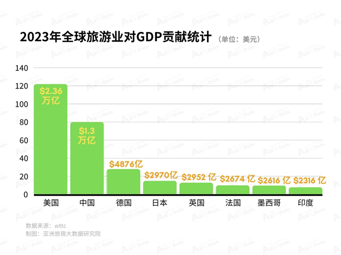 随着世界各地旅游市场的强劲复苏,旅游业也步入了高增长高质量发展阶段。世界旅游理事会(WTTC)8月发布《2024年经济影响趋势报告》。报告显示,2023年美国旅游业对国内生产总值(GDP)的贡献达到了创纪录的2.36万亿美元,美国仍然是全球最大的旅游市场, 中国去年旅游业的GDP贡献为1.3万亿美元,德国位居第三,贡献了4876亿美元。日本排名上升,从第五位升至第四位,贡献了2970亿美元。英国位列第五,贡献了 2952 亿美元。而全球游客最多的法国,以2647亿美元的贡献,屈居第六。紧随其后的是墨西哥,旅游收入达 2616 亿美元.此外,印度异军突起,取得了显著进步,以2316亿美元的贡献攀升至第八位,其在全球旅游市场的影响力日益增强。
