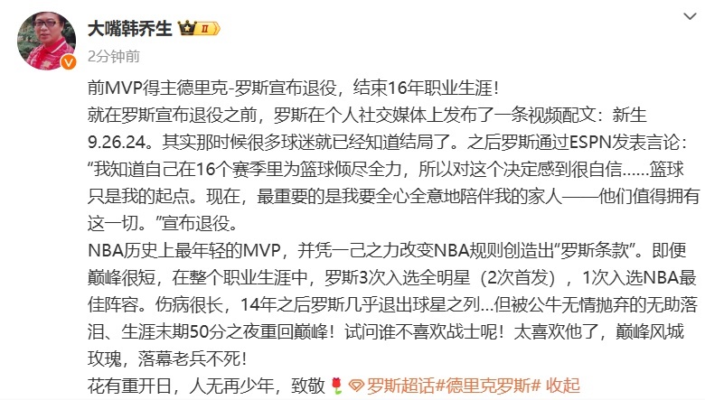 解说员韩乔生随后在社媒上发文向罗斯致敬:NBA历史上最年轻的MVP,并凭一己之力改变NBA规则创造出“罗斯条款”。即便巅峰很短,在整个职业生涯中,罗斯3次入选全明星(2次首发),1次入选NBA最佳阵容。伤病很长,14年之后罗斯几乎退出球星之列……但被公牛无情抛弃的无助落泪、生涯末期50分之夜重回巅峰!试问谁不喜欢战士呢!太喜欢他了,巅峰风城玫瑰,落幕老兵不死!