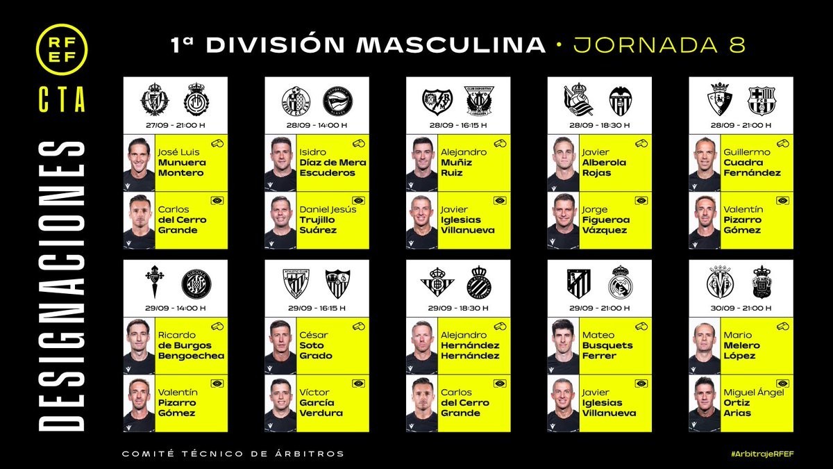 西班牙足协官方公布了西甲第8轮裁判安排,马特奥-布斯克茨将执法马德里德比,吉列尔莫-夸德拉将执法奥萨苏纳vs巴塞罗那。