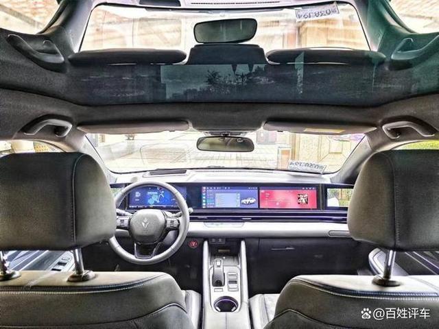 最大的亮点是贯穿式的连屏设计,从主驾驶的左侧一直延伸到驾驶室的右侧。一共是五屏联动,分别是主副驾驶两侧小屏幕加全液晶仪表盘、中央控制屏幕、副驾驶娱乐屏幕。中控屏、仪表屏和副驾屏的尺寸均为12.3英寸,三块屏幕支持流转互通,内置有主流的应用,聊天、听歌、观影随心所欲。