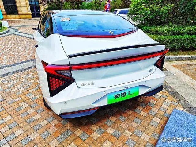 车尾部分,灵悉L的贯穿式尾灯造型细长,且两侧向回弯折,形成三角形的红色灯组,这就和车头区域形成对应,增强了车辆的整体感。尾部黑色尾翼突起,有点俏皮的感觉。后风挡下方V字型的高位刹车灯采用了钻石切面造型,为车辆增添了几分运动感。车标的设计同样引人注目,与车头一样,展现出强烈的设计感。