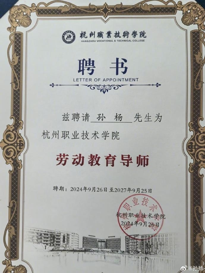 聘书显示,孙杨先生被聘为杭州职业技术学院劳动教育导师,聘期为2024年9月26日至2027年9月25日。
