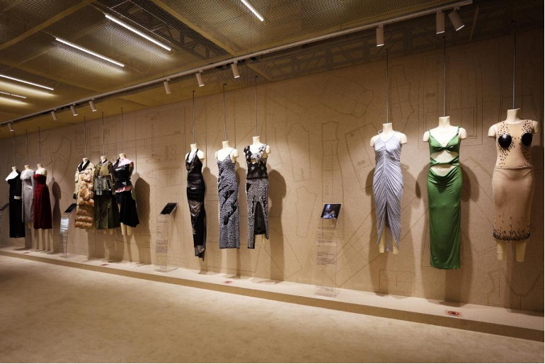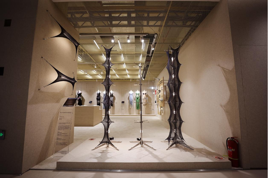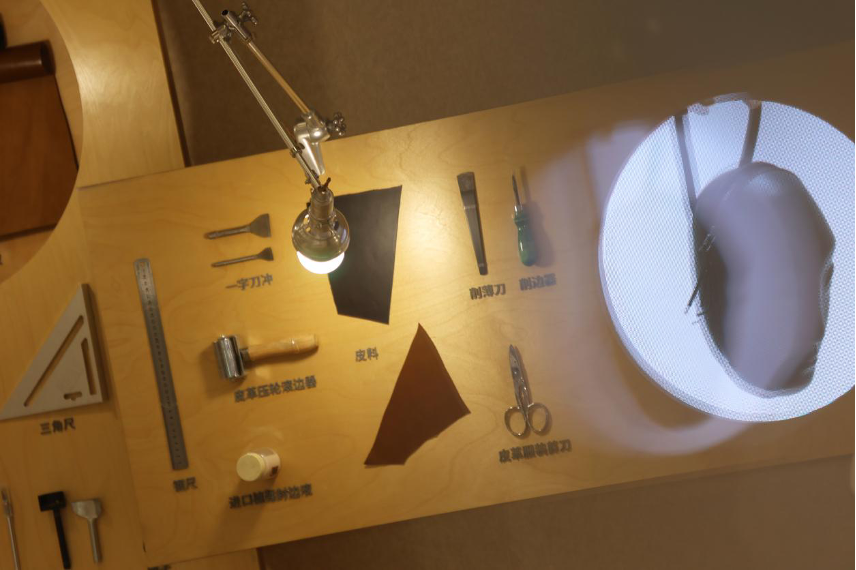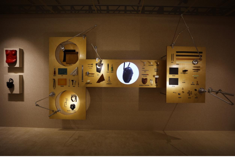B区为时装艺术创作主题墙,探索了时尚与艺术的融合。该区域还原了 Zhong Zixin 品牌手工压皮系列的制作过程,展示了该过程所需的工具材料以及相应的成品展示。尤为特别的一点,设计师首次公开展出她独创的猫脸包模具,在时装艺术的工艺创新中,表达设计师作品雕塑般的质感和女性线条的独特美学。