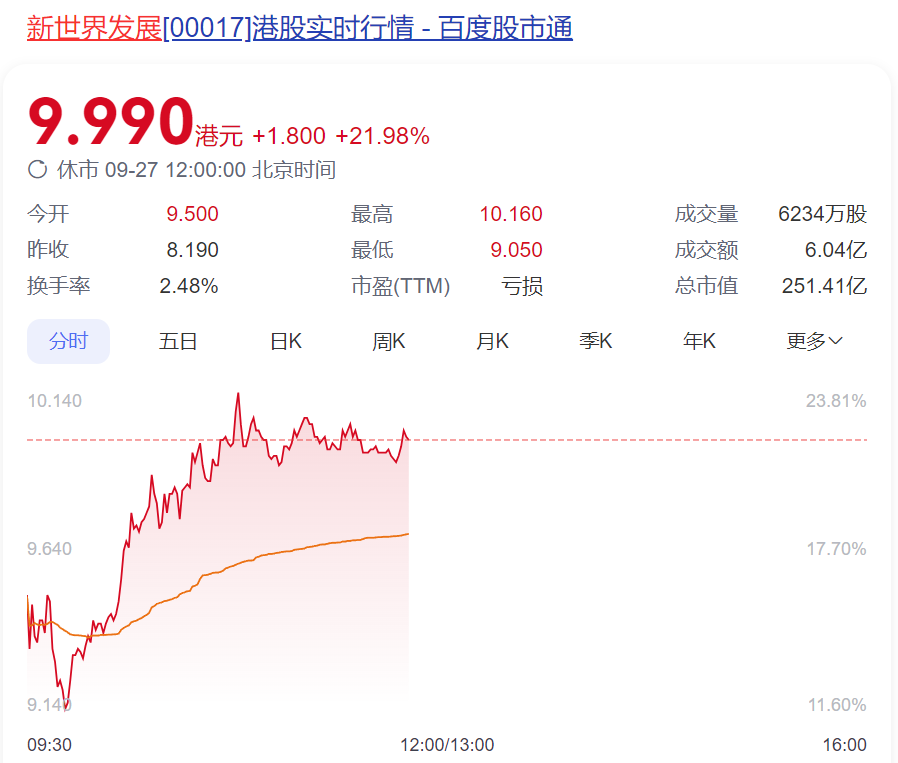 9月27日,港股地产板块全线上涨,截至中午休市,新世界发展暴涨近22%,报9.99港元。