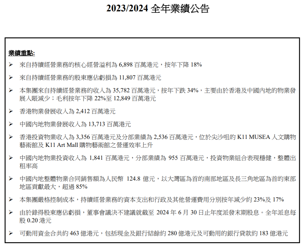 在新世界发展正式官宣郑志刚辞任行政总裁不久后,就召开了2024财政年度业绩发布会。2024财年(2023年7月1日~2024年6月30日),新世界发展股东应占亏损约196.83亿港元(约合人民币177.45亿元),这也是新世界发展近20个财年以来首次出现亏损;来自持续经营业务的收入约为357.82亿港元,同比下跌34%;来自持续经营业务的核心经营溢利为68.98亿港元,同比下跌18%。