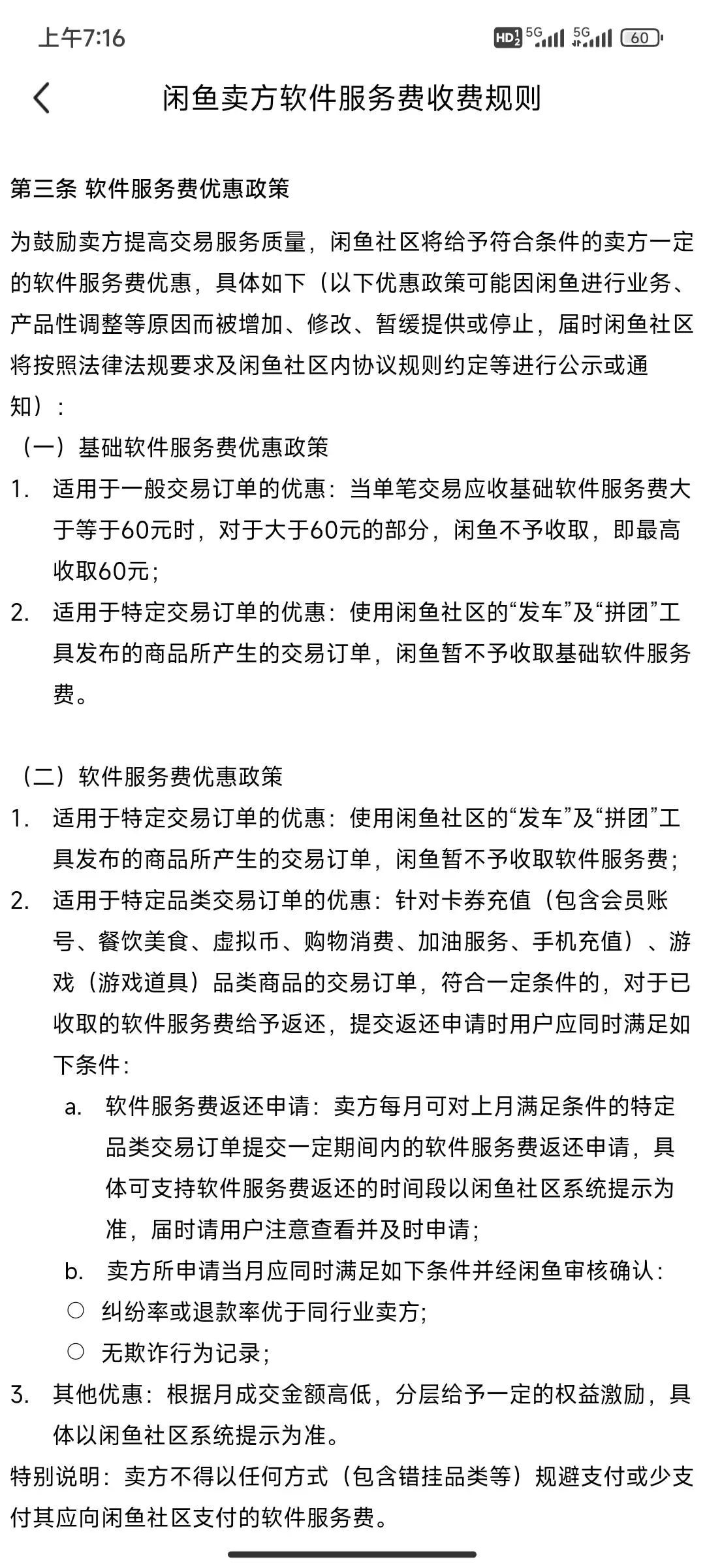 基础软件服务费很多账号都说,闲鱼封顶 60 元,这是妥妥的误传,闲鱼优惠规定是单笔交易基础软件服务费,封顶 60 元。也就是单次交易额满 1 万元时,触发封顶费用,即使单次交易额 2 万元,也就是收 60 元基础软件服务费。注意,这里和软件服务费是区分结算的,是否收软件服务费要考虑月交易次数。
