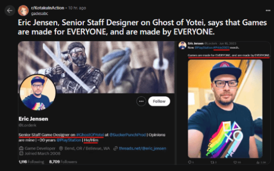 有玩家表示虽然演员本人是LGBT人士,但不代表游戏内容中存在LGBT元素。但随着网友们的深挖,有人发现《羊蹄山之魂》的高级设计师 Eric Jensen 似乎也是一位提倡“文化觉醒”的积极分子,他曾公开表示“游戏是为每个人而制作的,也是由各式各样的人开发的”,其个人简介中也使用了代词。
