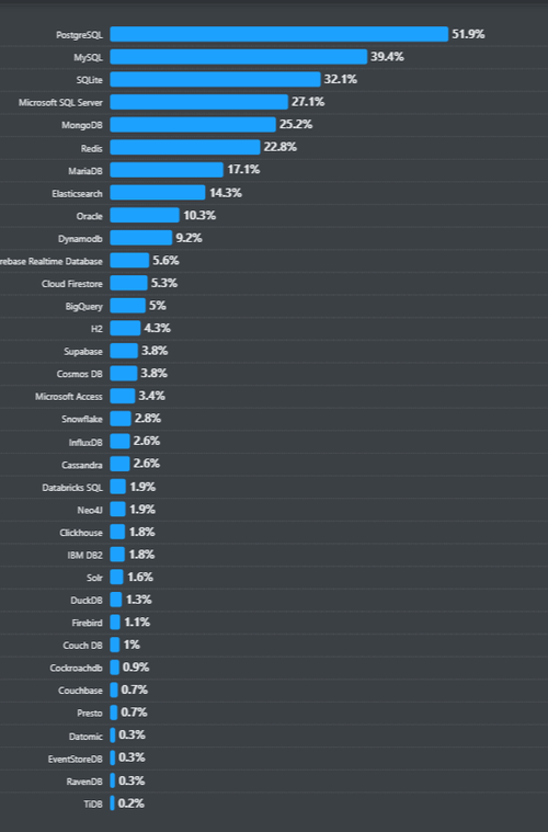 根据Stack Overflow最近的一项调查,Postgres是最流行的数据库